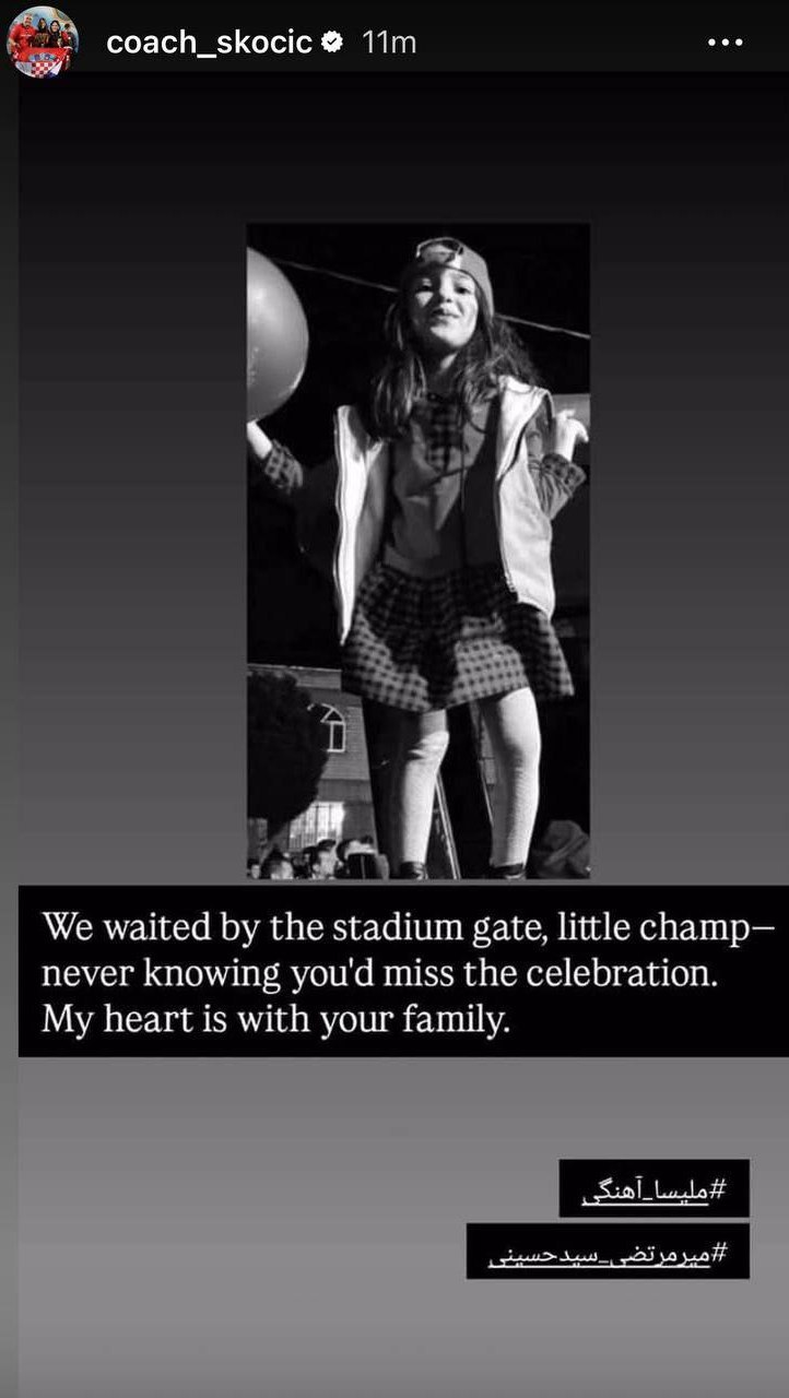 اسکوچیچ با انتشار تصویر کودک قربانی این حادثه و پیام احساسی در صفحه اجتماعی خود از وقوع آن ابراز تأسف کرده و نوشت: «کنار دروازه ورزشگاه منتظرت بودیم، قهرمان کوچولو؛ هیچوقت فکر نمیکردیم جشن قهرمانی را از دست بدهی. قلبم با خانوادهات است.»