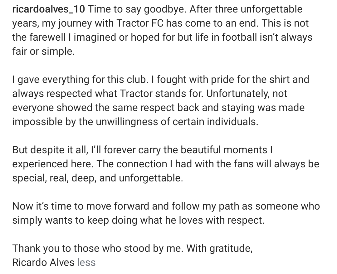 من همهچیزم را برای این باشگاه گذاشتم. با افتخار برای این پیراهن جنگیدم و همیشه به آنچه تراکتور نمایندهاش بود، احترام گذاشتم. متأسفانه، همه همان احترام را متقابلاً نشان ندادند و ماندن بهدلیل بیمیلی برخی افراد، غیرممکن شد.