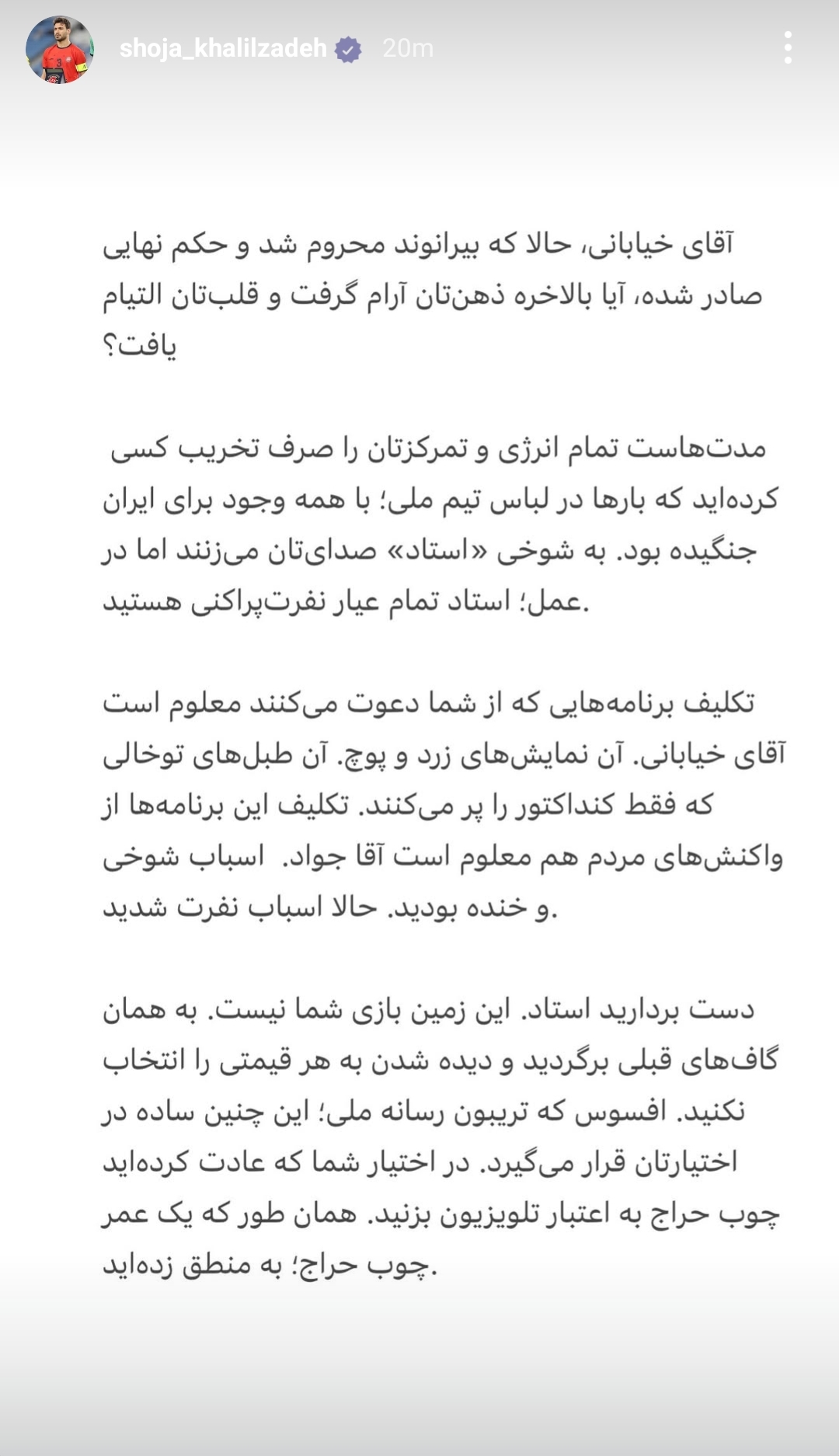در همین راستا، شجاع خلیلزاده، مدافع باتجربه و کاپیتان ملیپوش تراکتور با انتشار پیامی در فضای مجازی ضمن حمایت از علیرضا بیرانوند، به انتقاد از رفتارها و حاشیهسازیهای جواد خیابانی، گزارشگر و مجری باسابقه صداوسیما پرداخت.