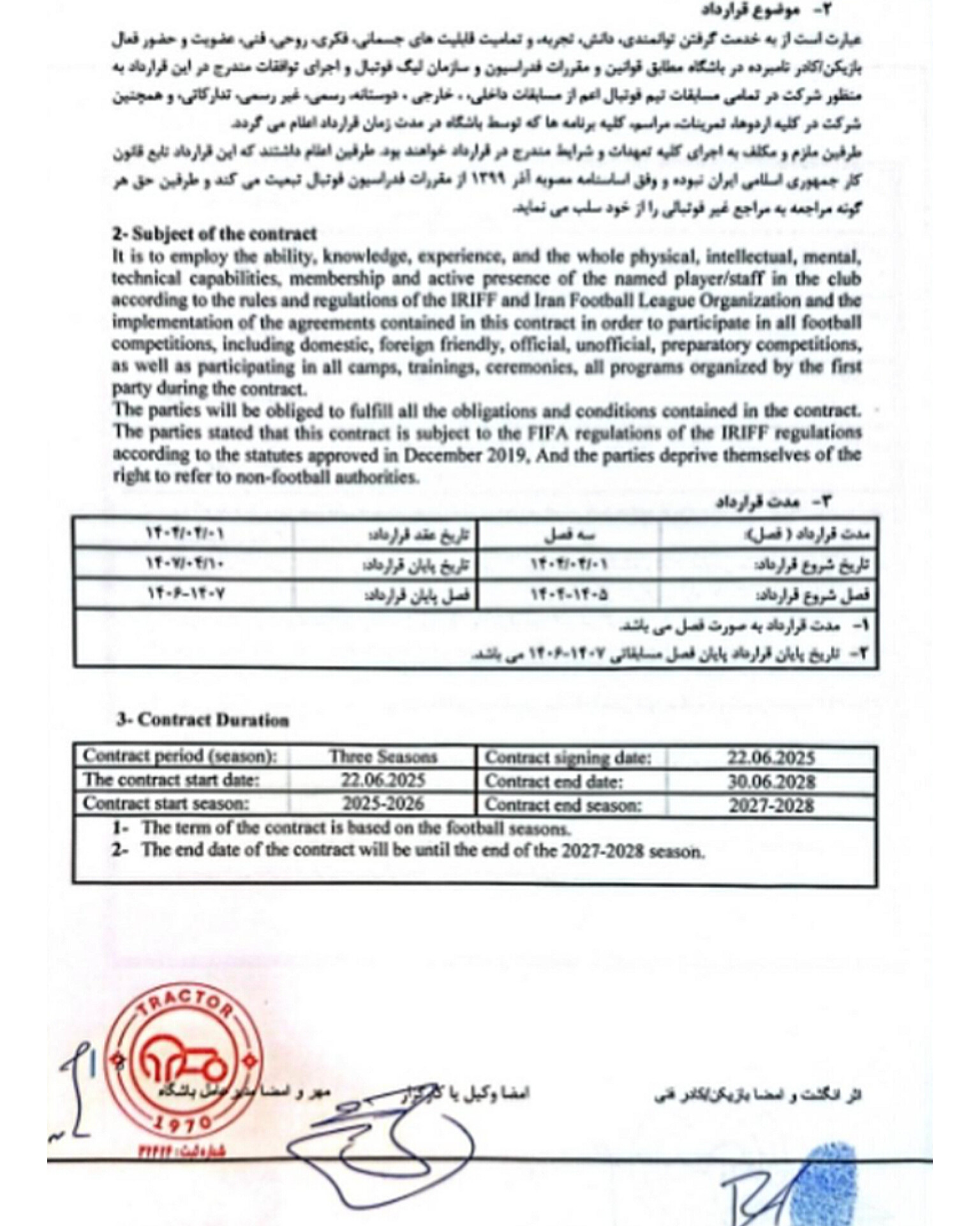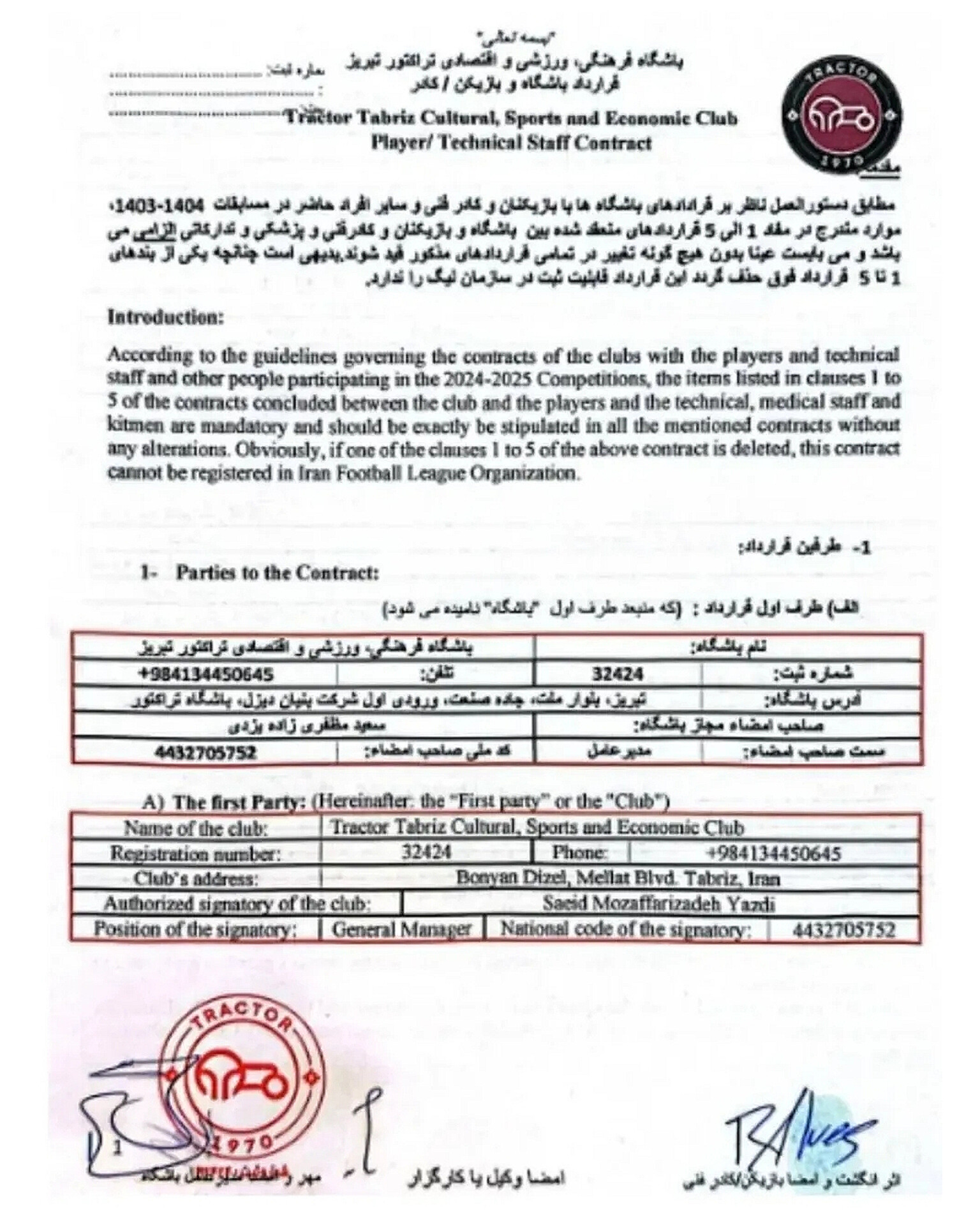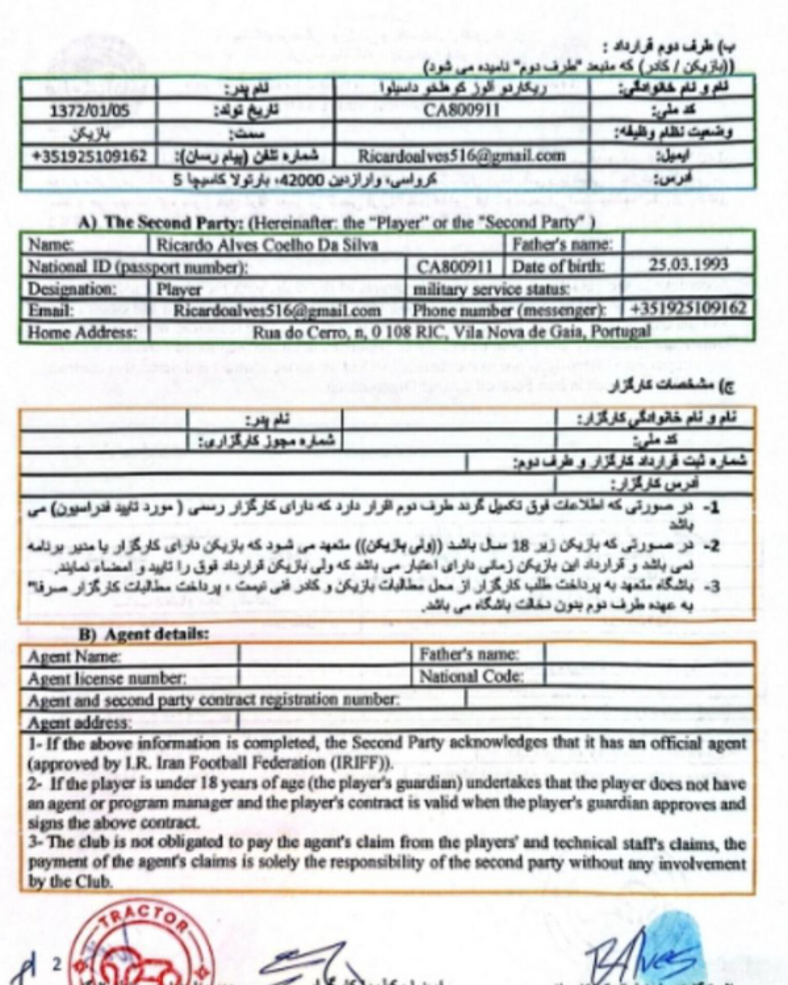 در ادامه این ماجرا، خبرگزاری فارس اقدام به انتشار تصاویری از قرارداد رسمی ریکاردو آلوز با تراکتور کرد که نشان میدهد در این قرارداد هیچ بند فسخی درج نشده است. مسئلهای که میتواند به یک پرونده جدی حقوقی در فوتبال ایران منجر شود.