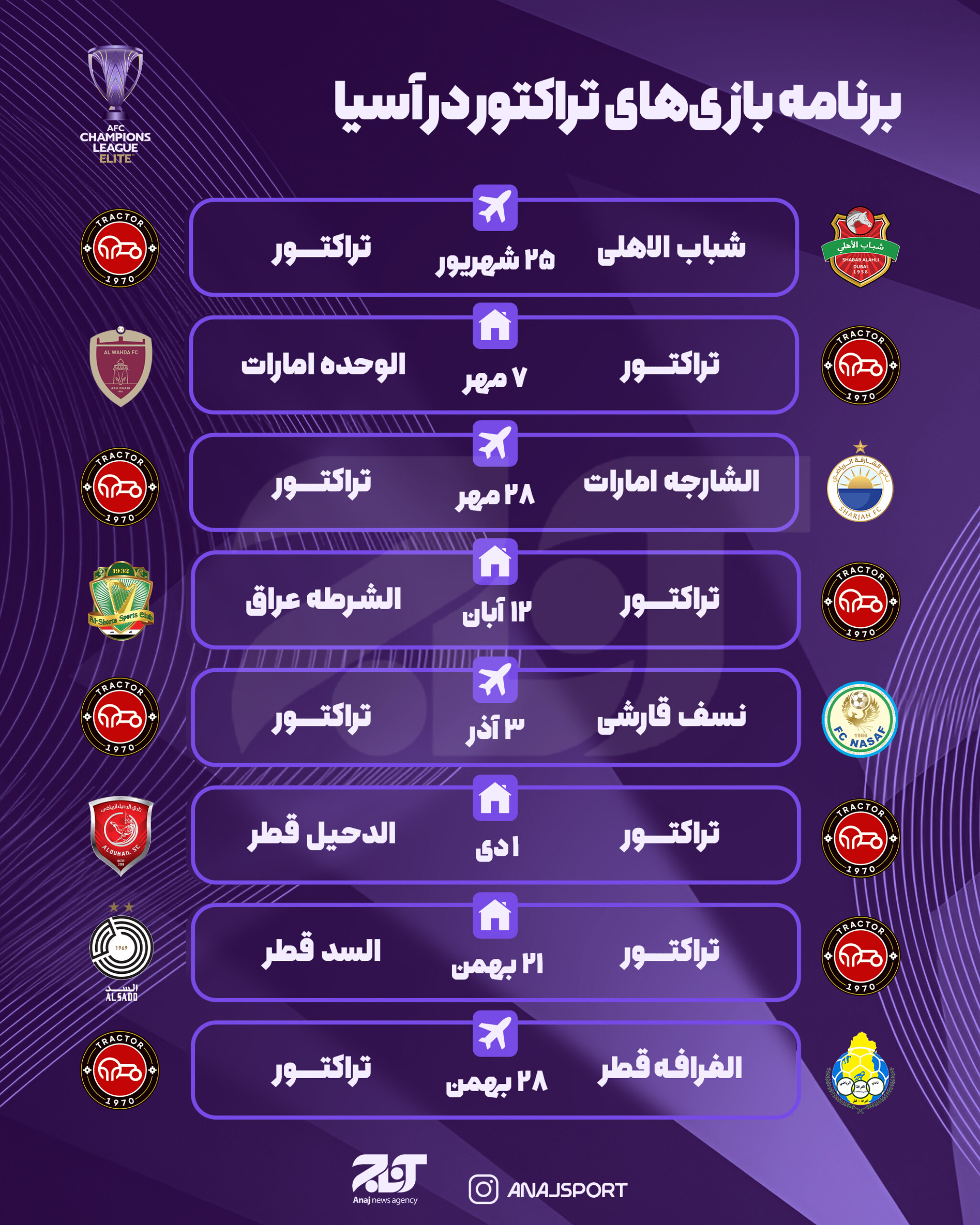 بر همین اساس، تراکتور بهعنوان تنها نماینده کشورمان در این رقابتها طبق برنامه زمانبندی زیر به مصاف حریفان خود خواهد رفت:
