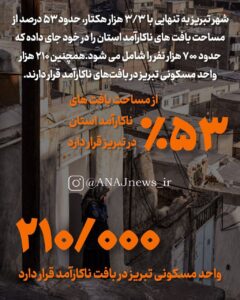 شهر تبریز به تنهایی با ۳/۳ هزار هکتار، حدود ۵۳ درصد از مساحت بافتهای ناکارآمد استان را در خود جای داده که حدود ۷۰۰ هزار نفر معادل ۷۰ درصد جمعیت را شامل میشود که ۲۱۰ هزار واحد مسکونی تبریز در بافتهای ناکارآمد قرار دارند.