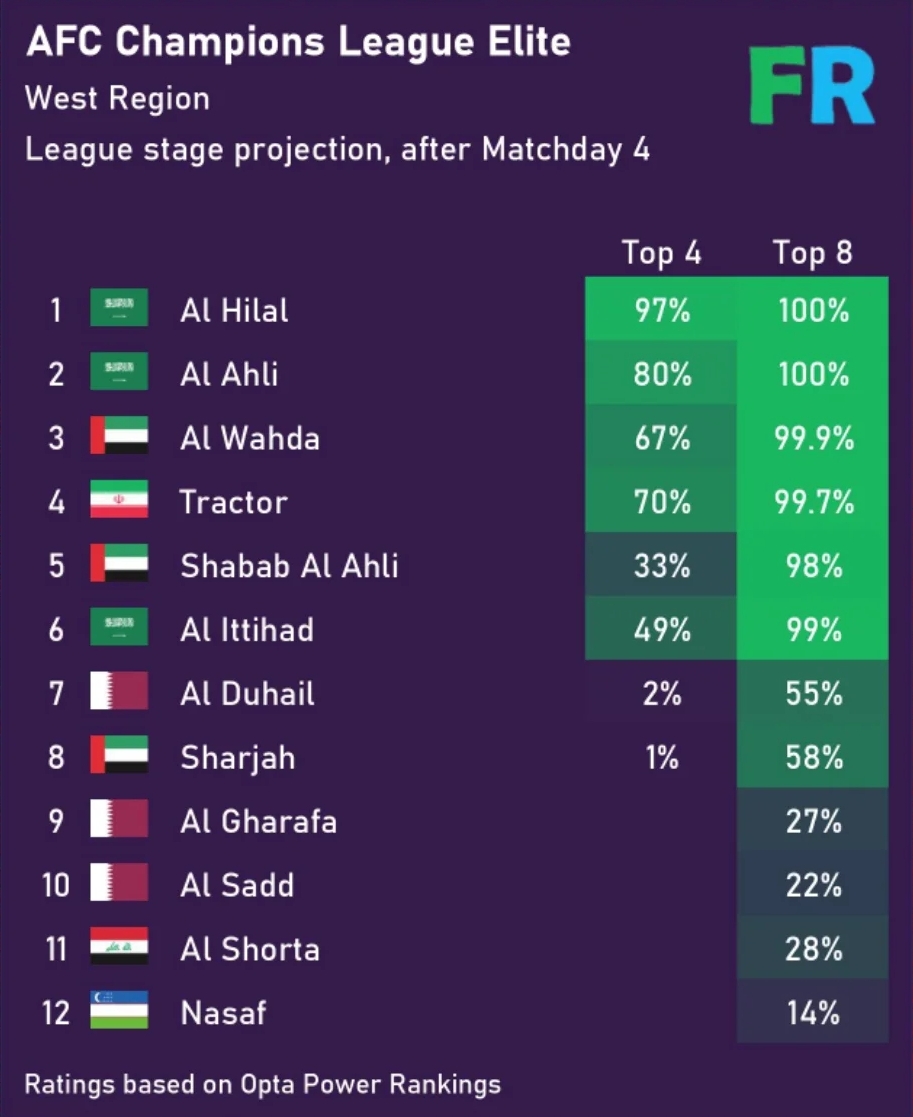 بر اساس تحلیل آماری سایت بینالمللی «فوتیرنکینگ»، شانس تیم تراکتور برای صعود به مرحله حذفی لیگ نخبگان آسیا ۹۹.۷ درصد برآورد شده است.