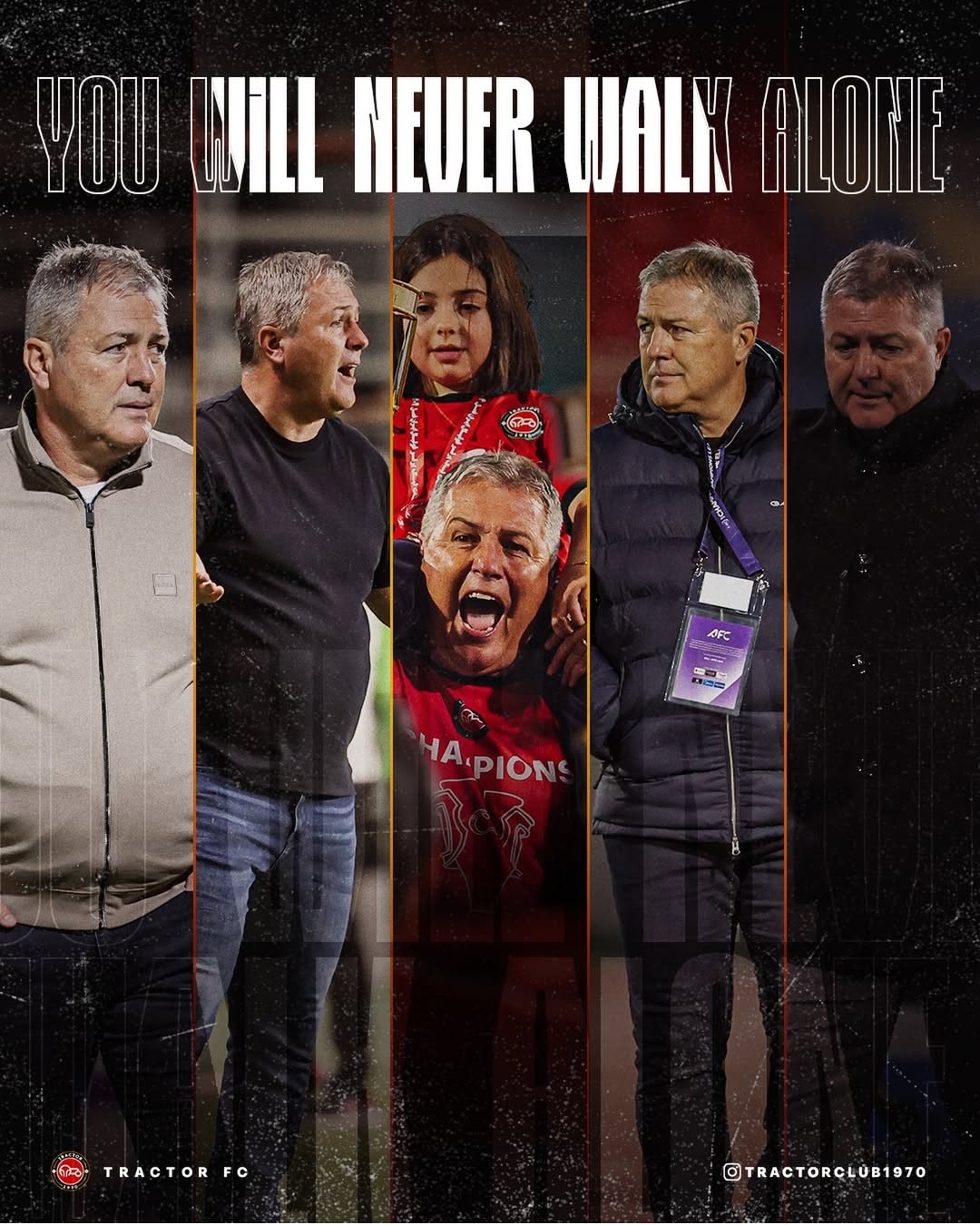 در این پوستر، شعار مشهور لیورپولیها «تو هرگز تنها قدم نخواهی زد» نقش بسته و همراه با آن، پیام «متحد در کنار هم» نیز منتشر شده است. پیامی که نشان از عزم تراکتوریها برای ادامه مسیر همراه با سرمربی خود دارد.