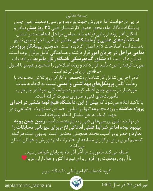 گفتنی است که گروه گیاه پزشکی دانشگاه تبریز در خصوص مراحل احیای چمن جدید یادگار اطلاعیهای نیز صادر کرده و در آن مدعی شده که تمامی اقدامات با هماهنگی پیمانکار پروژه انجام و توسط مشاور گیاه پزشکی باشگاه رئال مادرید تأیید شده است.
