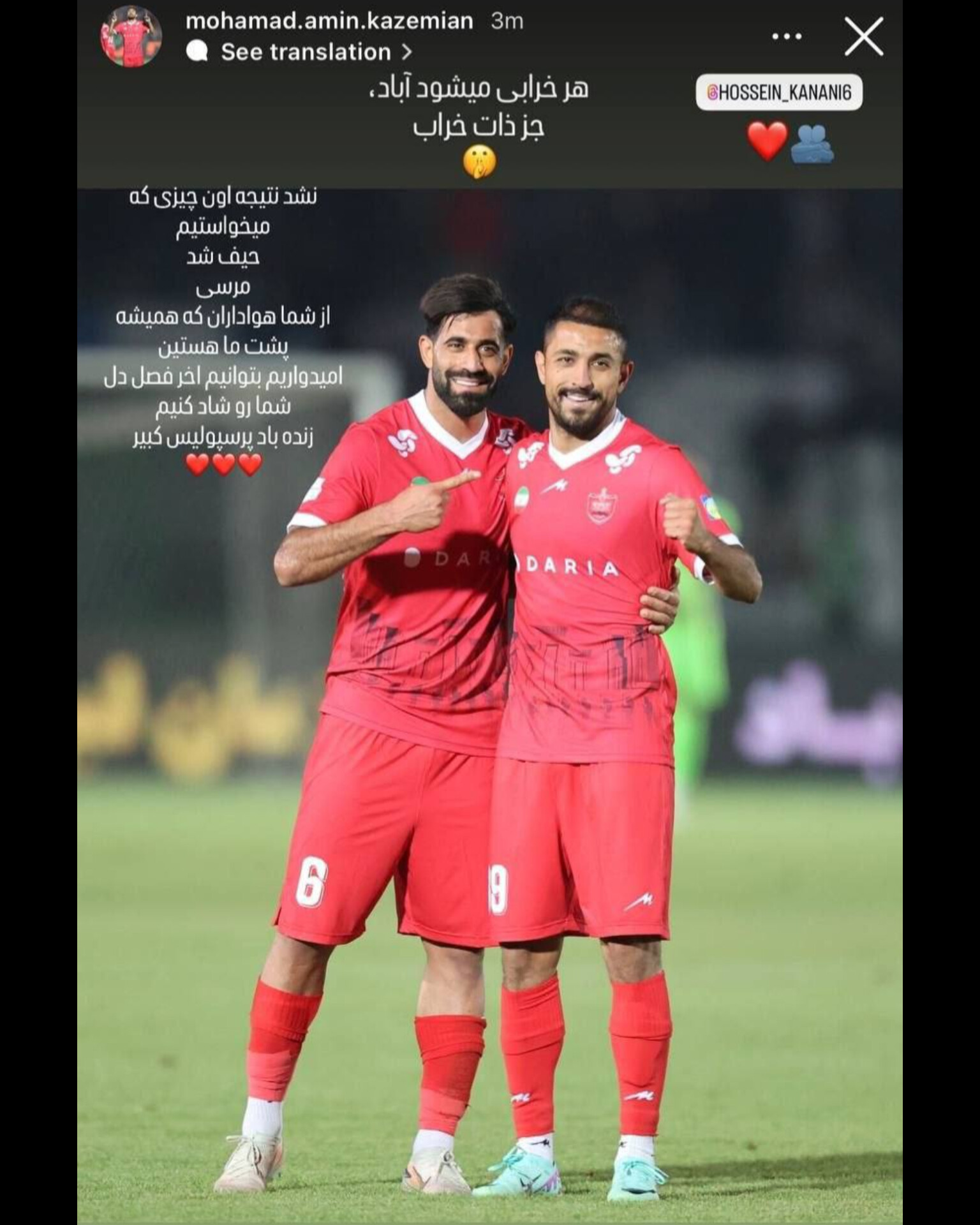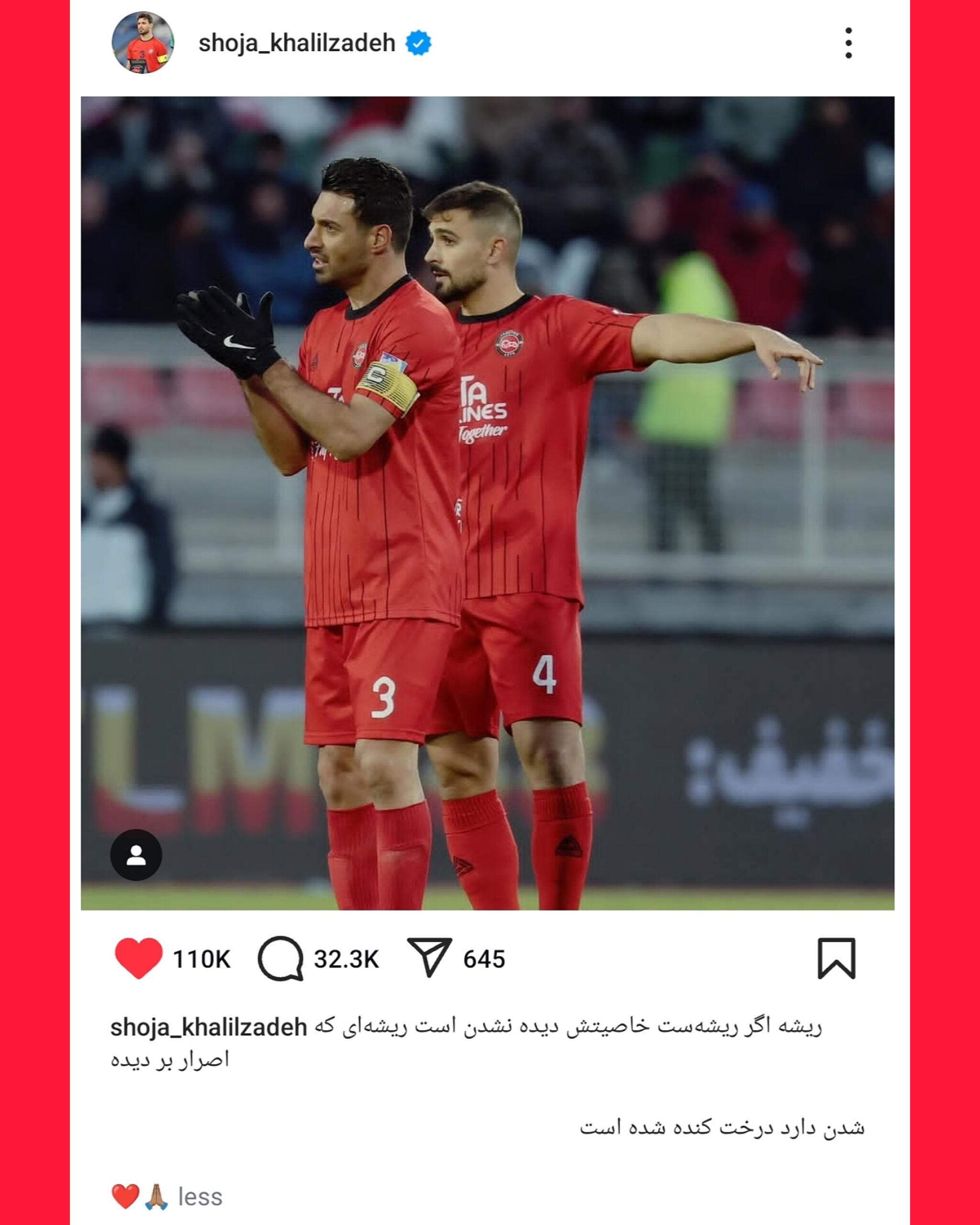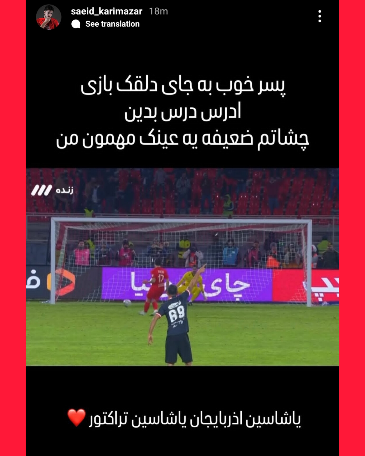 این بازیکن بومی تراکتور دقایقی پیش با انتشار استوری در صفحه شخصی خود به این صحنه اشاره کرد و نوشت: «پسر خوب بهجای دلقکبازی، آدرس درست بده، چشمات هم ضعیفه یک عینک مهمون من!»؛ جملهای که کنایه سنگین به شادی و رفتار کاظمیان پس از ضربه پنالتی و واکنش او به پست شجاع خلیلزاده است.