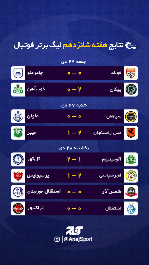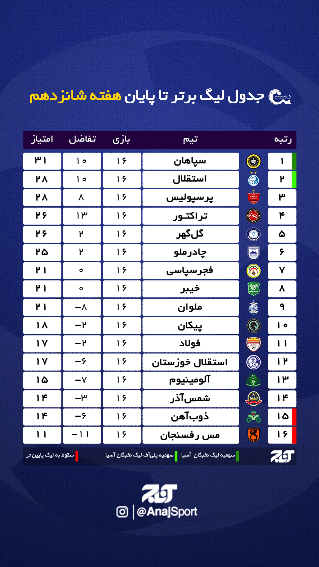 نتایج و جدول لیگ برتر فوتبال در پایان هفته شانزدهم به قرار زیر است: