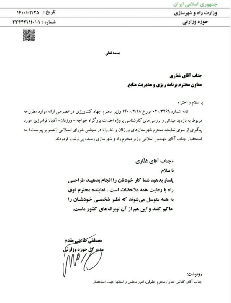 وزیر راه خطاب به دهقانی گفته است: شما کار خودتان را انجام دهید. طراحی راه با رعایت همه ملاحظات است. نماینده محترم به همه متوسل میشوند که نظر شخصی خودشان را حاکم کنند و این هم از آن نوبرانههای کشور ماست!