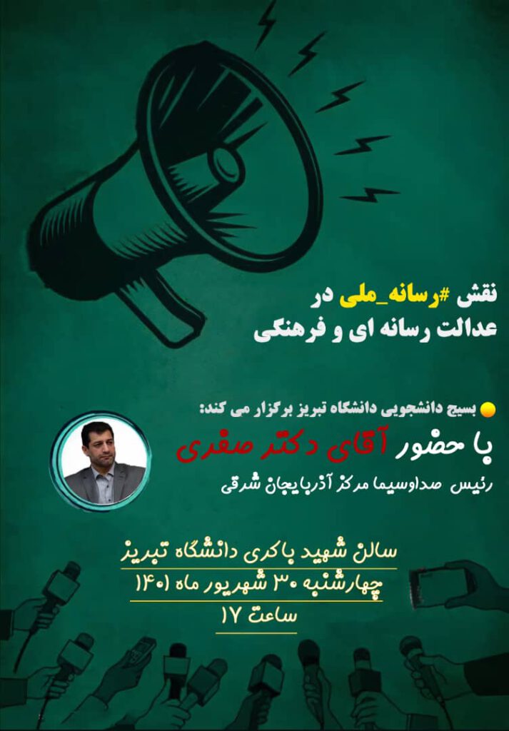 به گزارش آناج، بسیج دانشجویی دانشگاه تبریز نشستی با موضوع نقش رسانه ملی در عدالت رسانهای و فرهنگی برگزار میکند.