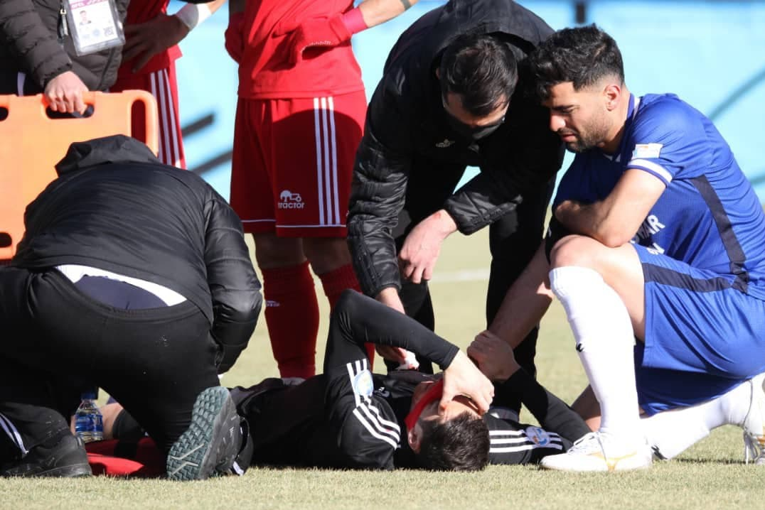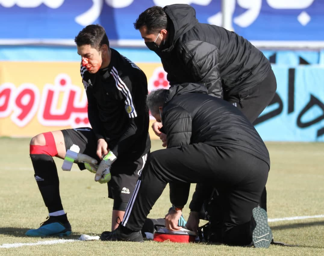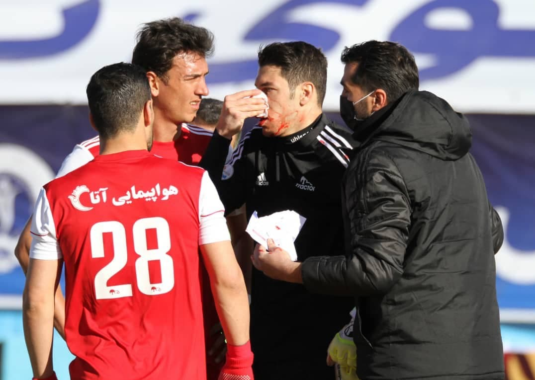 اخباری در مصاف تک به تک با منشا برخورد شدیدی با مهاجم حریف داشت که این برخورد باعث شد تا گلر تراکتور از ناحیه بینی آسیب ببیند.