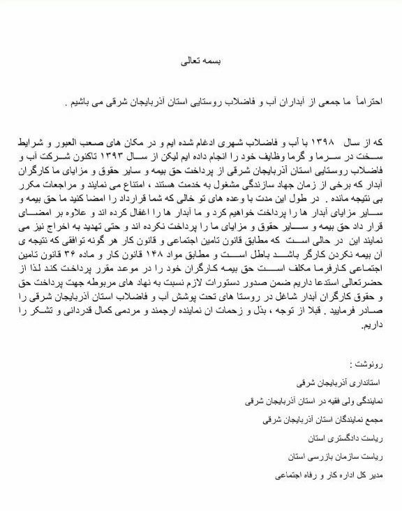به گزارش آناج، در حالی که این روزها فشار اقتصادی زندگی بخش عظیمی از مردم و به ویژه کارگران را تحت شعاع قرار داده است ظاهرا پایمال کردن حقوق اولیه آنان در ادارات و سازمان‌های دولتی به مساله‌ای عادی تبدیل شده است. جمعی از آبداران آب و فاضلاب روستایی آذربایجان‌شرقی با ارسال نامه‌ای به تحریریه آناج خواستار رسیدگی به وضعیت دریافتی و ارعاب و تهدید پیمانکاران شده‌اند.