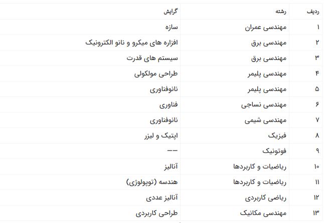 متقاضیان می توانند حداکثر دو رشته/گرایش را مطابق جدول ذیل انتخاب کنند.