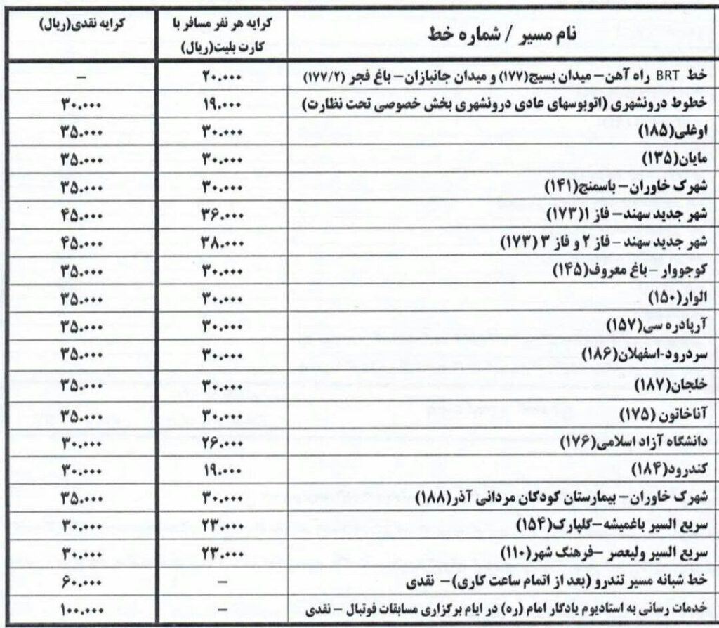 از سوی دیگر یکی از نرخهای اعلام شده برای مسافران علامت سوال ایجاد کرده است؛ در حالیکه کرایه اتوبوسهای یادگار امام (ره) در روزهای مسابقه 10 هزار تومان اعلام شده اما مشخص نیست این کرایه برای مسیر چهارراه عباسی تا ورزشگاه یادگار امام تعیین شده یا از ابتدای اتوبان تا ورزشگاه!