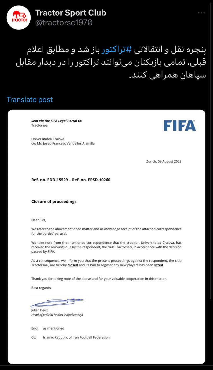 باشگاه تراکتور با پرداخت طلب باشگاه رومانیایی موفق شد پنجره نقل‌وانتقالاتی خود را در آستانه بازی با سپاهان باز کند.