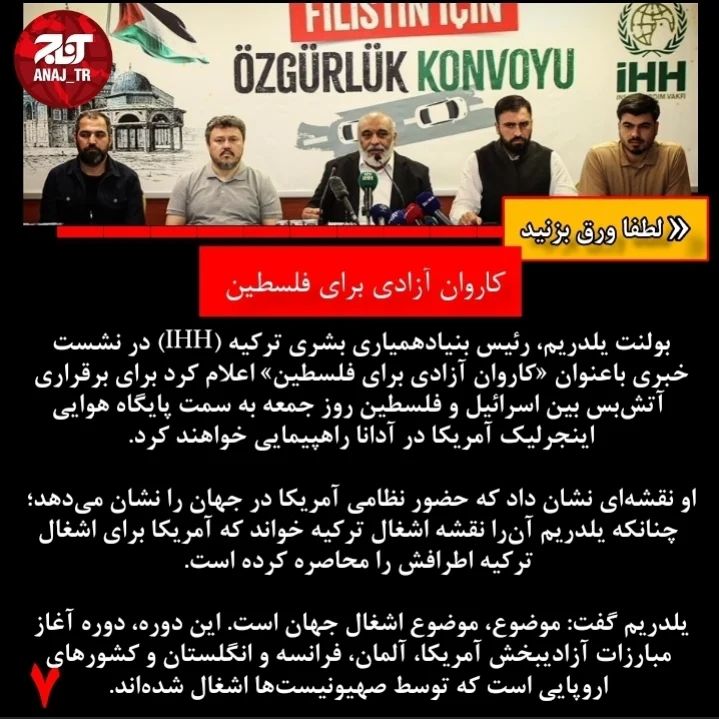 بولنت یلدریم، رئیس بنیاد همیاری بشری ترکیه (H) در خبری با عنوان کاروان آزادی برای «فلسطین اعلام کرد برای برقراری آتش بس بین اسرائیل و فلسطین روز جمعه به سمت پایگاه هوایی اینجرلیک آمریکا در آدانا راهپیمایی خواهند کرد.
