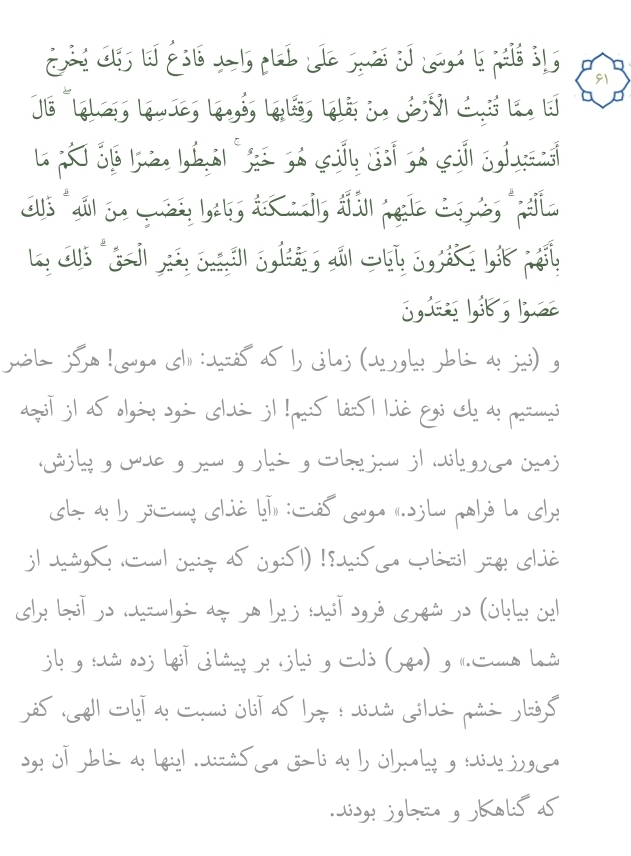 برای امروز آیات ۶۱ الی ۶۳ سوره بقره را میخوانیم: