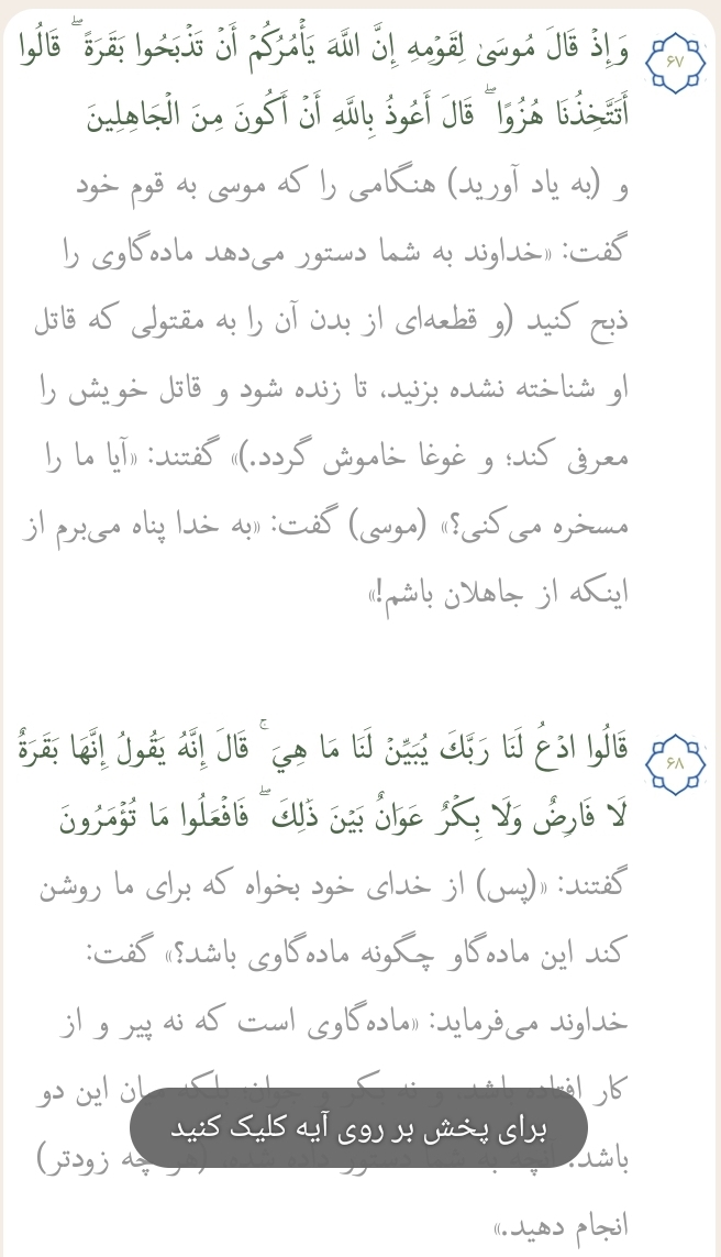 برای امروز آیات ۶۷ و ۶۸ سوره بقره را میخوانیم: