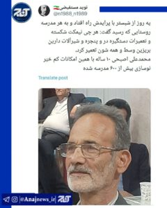 «یه روز از شبستر با پرایدش راه افتاد و به هر مدرسه روستایی که رسید گفت هر چی تعمیرات نیمکت شکسته، دستگیره در و پنجره و شیرآلات دارین بریزین وسط و همهشون رو تعمیر کرد؛محمد علی اصبحی ۱۰ ساله با همین امكانات كم خير، باعث نوسازی بیش از ۶۰۰ مدرسه شده»