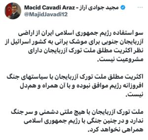 به گزارش پایگاه خبری تحلیلی «آناج»، در حالی که مردمان استانهای آذرینشین از دیشب در اوج شادی و خوشحالی از حمله و پاسخ تاریخی ایران به رژیمصهیونیستی به سر می برند، عنصر تجزیهطلب تُرک در یک توئیت خواسته از طرف آذریهای ایران از اسرائیل حمایت کند و سیاستهای کشور را را زیر سوال ببرد.