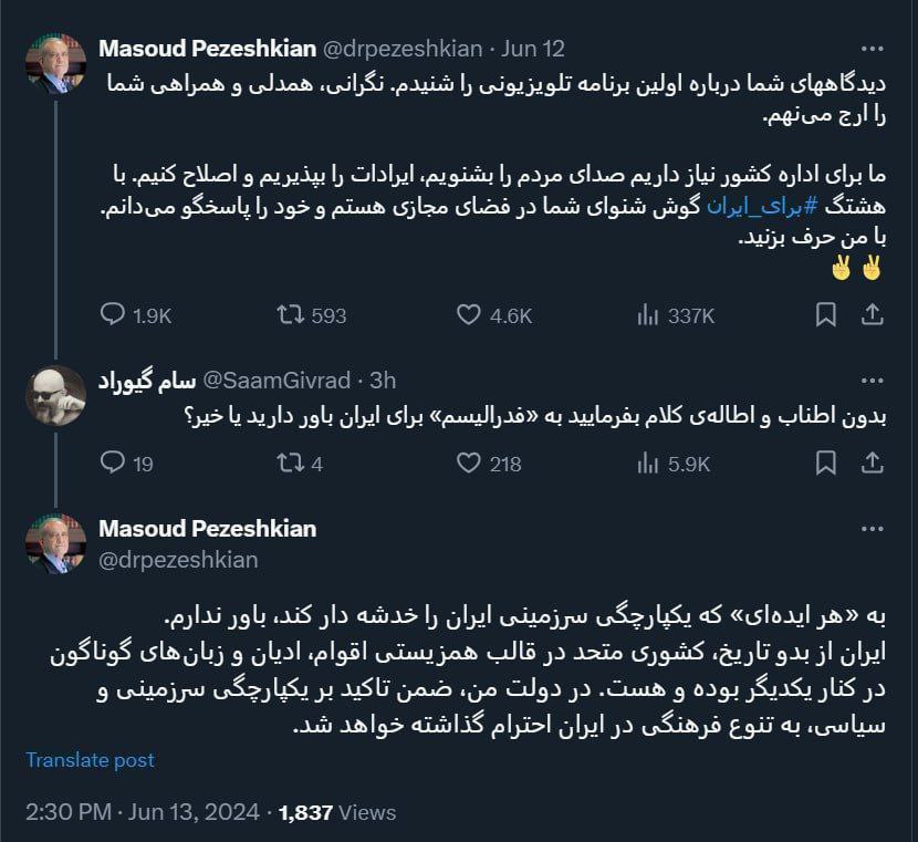 به گزارش پایگاه خبری تحلیلی «آناج»، مسعود پزشکیان روز گذشته در بستر شبکه اجتماعی ایکس(توئیتر سابق)، در پاسخ به یکی از مخاطبین خود، مبنیبر اینکه «فدرالیسم»، را قبول دارید یا خیر، نوشته بود: «به «هر ایدهای» که یکپارچگی سرزمینی ایران را خدشهدار کند، باور ندارم. ایران از بدو تاریخ کشوری متحد در قالب همزیستی اقوام، ادیان و زبانهای گوناگون در کنار یکدیگر بوده و هست در دولت من ضمن تاکید بر یکپارچگی سرزمینی و سیاسی، به تنوع فرهنگی در ایران احترام گذاشته خواهد شد.»