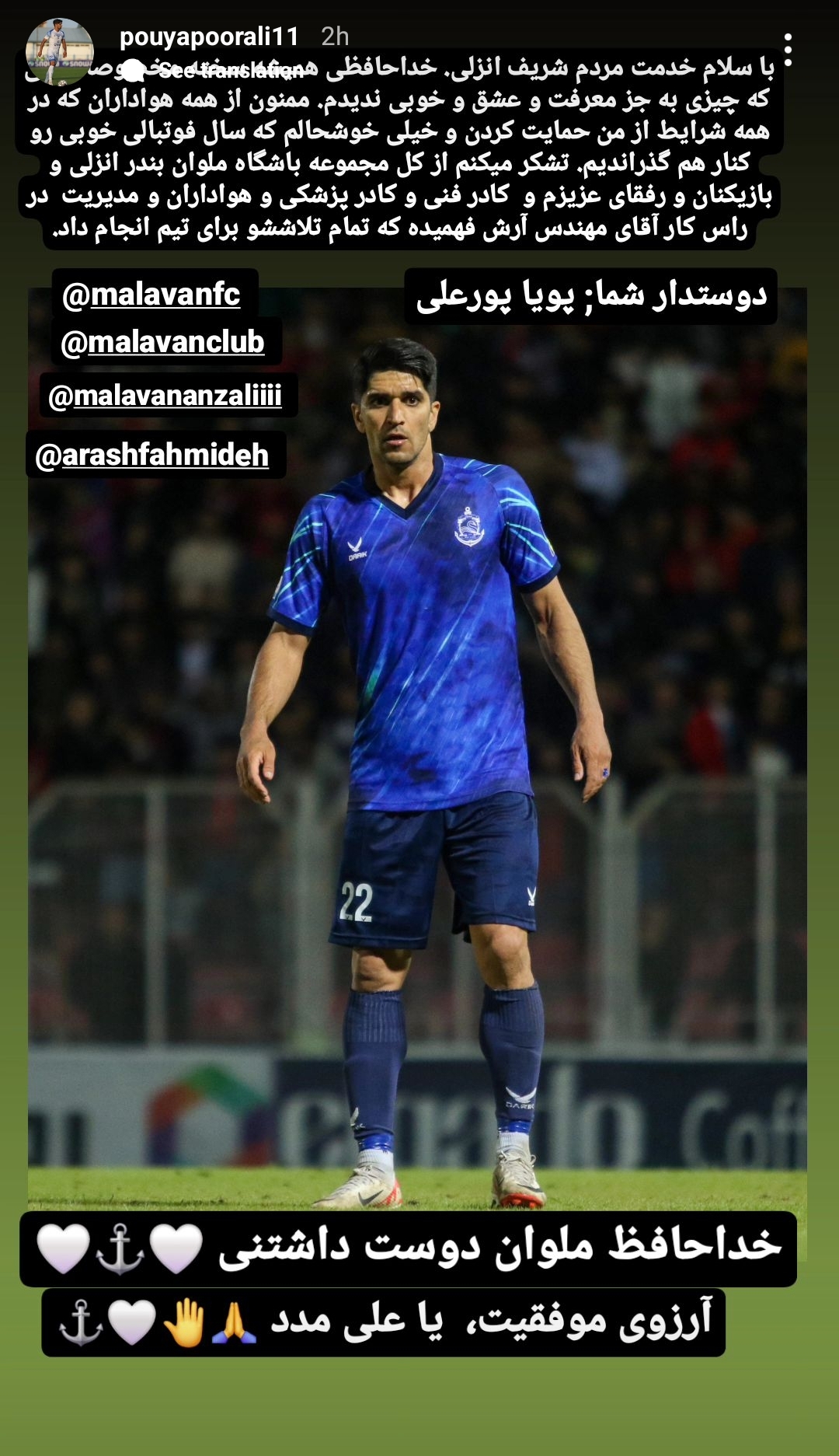 به گزارش خبرنگار سرویس ورزشی پایگاه خبری تحلیلی «آناج»، پویا پورعلی، هافبک فصل گذشته ملوان که با مسئولان تراکتور برای پیوستن به این تیم به توافق رسیده است، با انزلیچیها خداحافظی و جداییاش از این تیم را اعلام کرد.