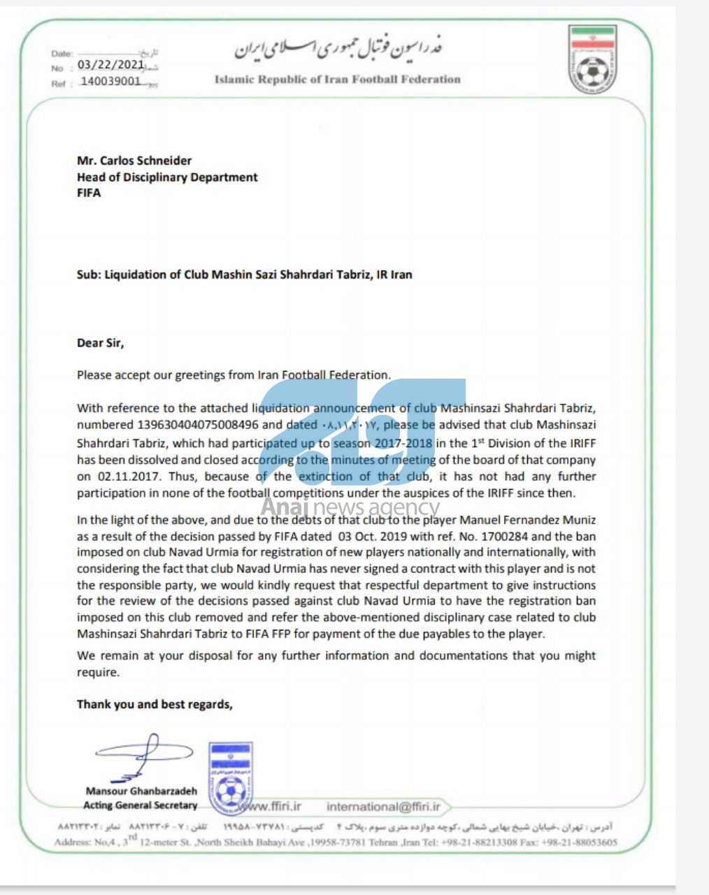 فدراسیون فوتبال کشورمان در این نامه تأکید کرده است که باشگاه نود ارومیه هیچ قراردادی با مانوئل فرناندز مونیز نداشته و مسئولیتی درباره مطالبات این بازیکن ندارد فلذا از این نهاد بینالمللی خواسته است تا دستورالعملهایی را جهت بررسی تصمیمات گذشته علیه باشگاه نود ارومیه برای لغو ممنوعیت اعمال شده در این باشگاه ارائه دهد و پرونده انضباطی فوق الذکر مربوط به باشگاه ماشینسازی شهرداری تبریز را به منظور پرداخت بدهی بازیکن طلبکار به قوانین فیرپلی مالی فیفا (FFP) ارجاع دهد.