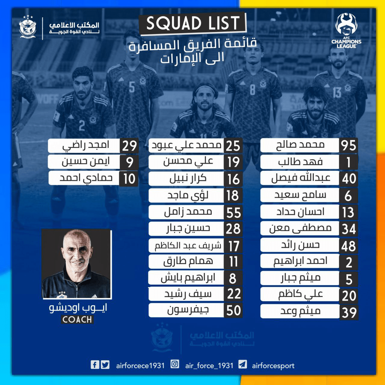 به گزارش آناج به نقل از فارس، باشگاه نیرو هوایی عراق لیست آسیایی خود برای حضور در مرحله گروهی لیگ قهرمانان آسیا 2021 را اعلام کرد.
