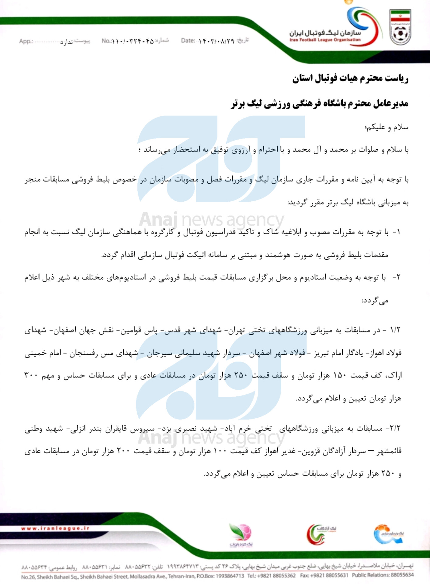 به گزارش خبرنگار سرویس ورزشی پایگاه خبری تحلیلی «آناج، سازمان لیگ فوتبال ایران در ابلاغیهای به باشگاههای لیگ برتری قیمت بلیت ورزشگاهها با مصوبات جدید و فصلی این سازمان را اعلام کرده است.