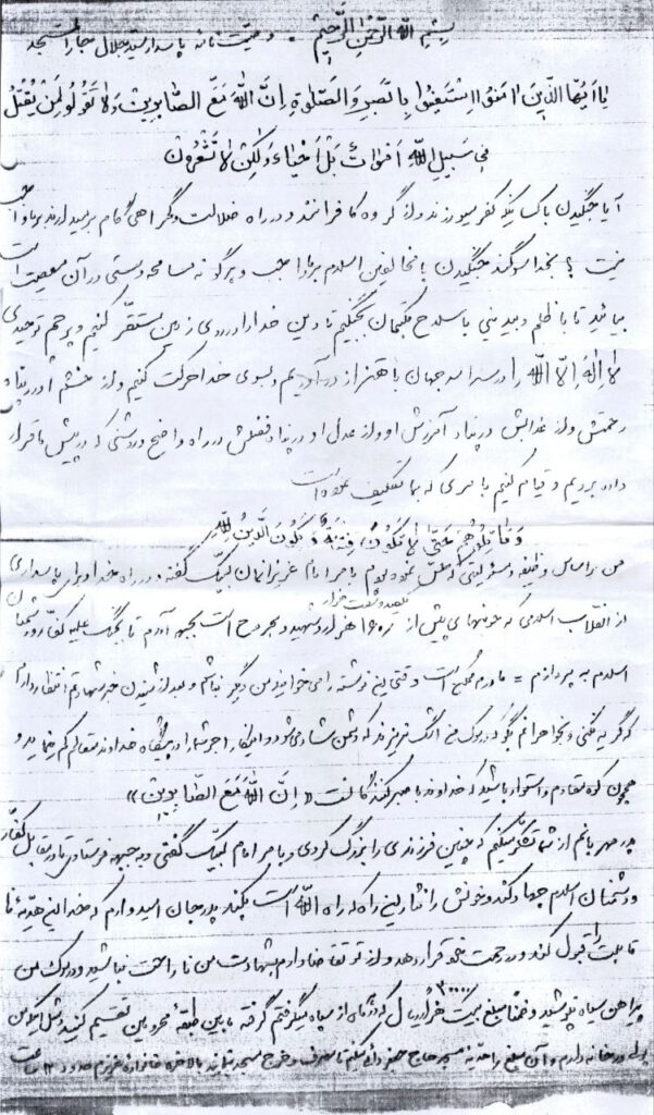 برادران مهربانم هوشيار باشيد و به غير اسلام و قرآن به چيز ديگري فکر نکنيد که هر چه خير و صلاح انسانست در اين کتاب آسماني نهفته است و شما نيز سعي کنيد که راه خدا را ترويج نمائيد و در اين راه از جان و مال خويش دريغ نفرمائيد و در به ثمر رساندن انقلاب هميشه کوش باشيد.